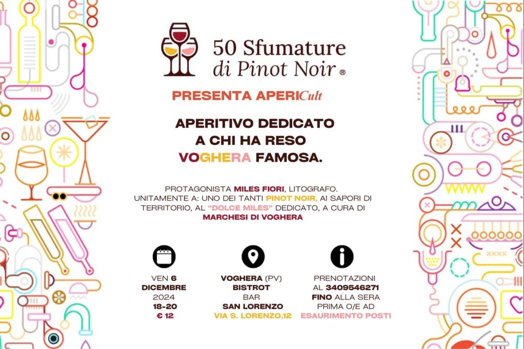 L’ Aperitivo Culturale dedicato a coloro che hanno reso famosa Voghera brindando rigorosamente con i migliori Pinot Noir e abbinando un piatto appositamente studiato da Laura Marchesi. Primi protagonisti il Litografo Miles Fiori e la Cantina La Genisia, primo partner ufficiale della prima edizione di 50 Sfumature di Pinot Noir.